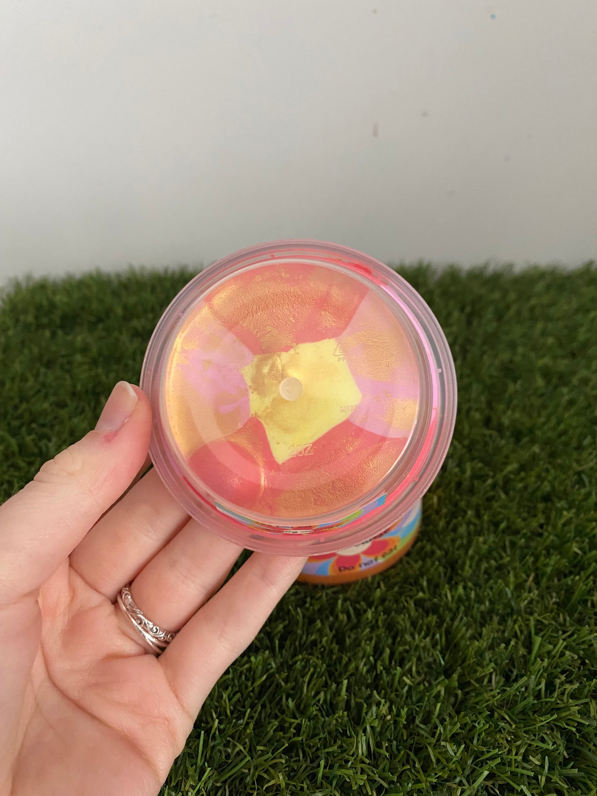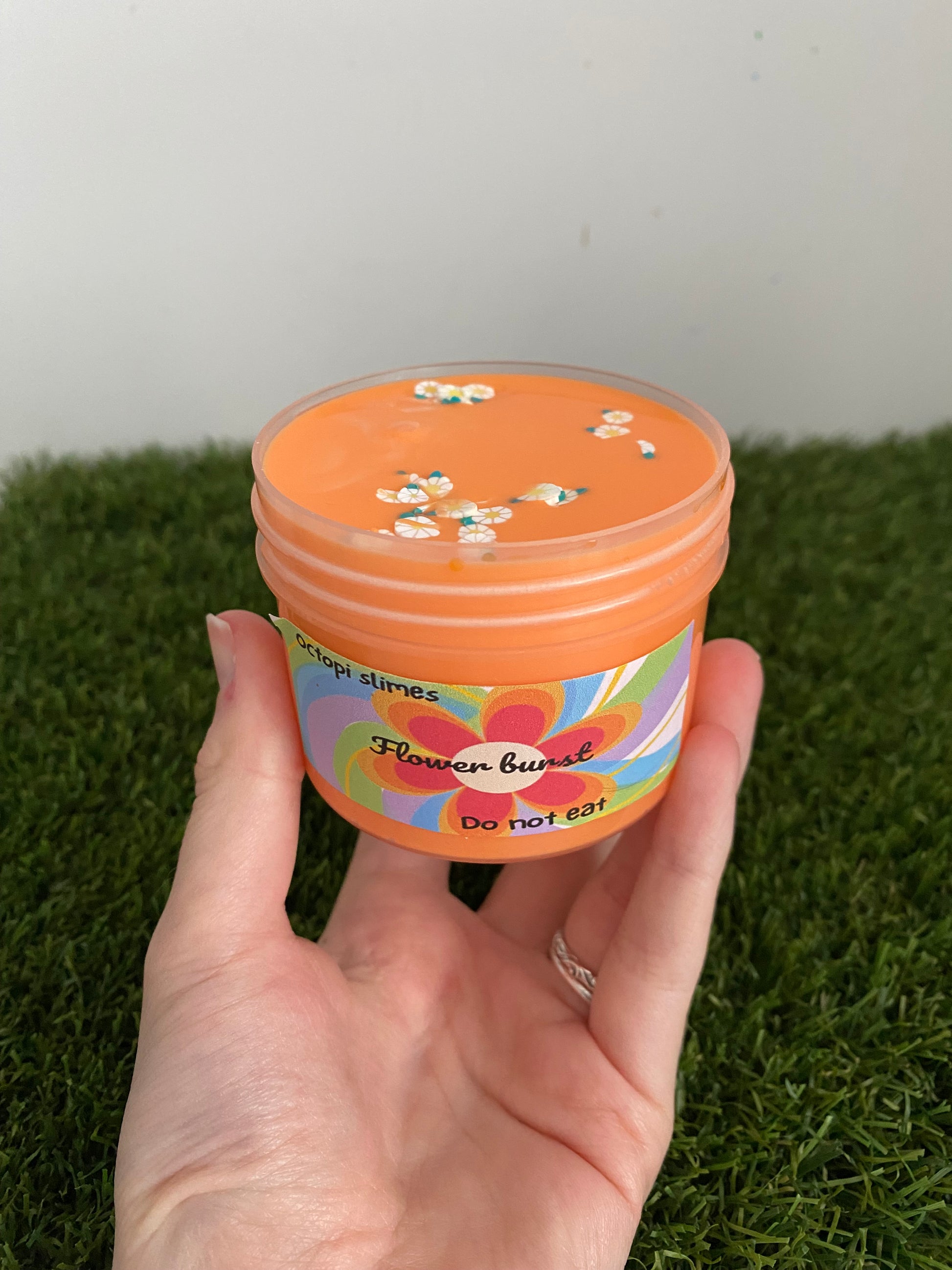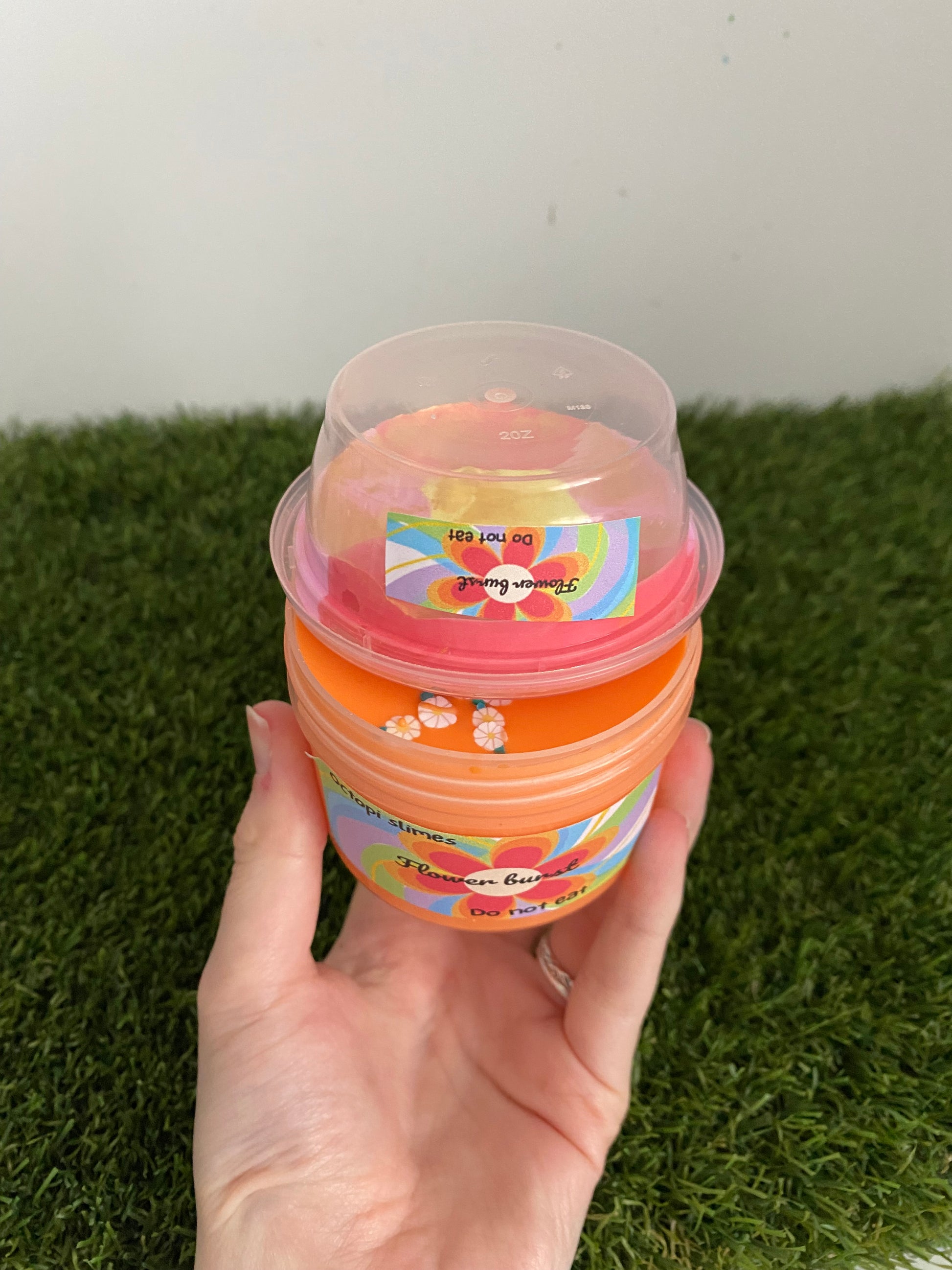 Flower burst is a thick and glossy slime with an abstract clay topper scented strawberry sherbet.