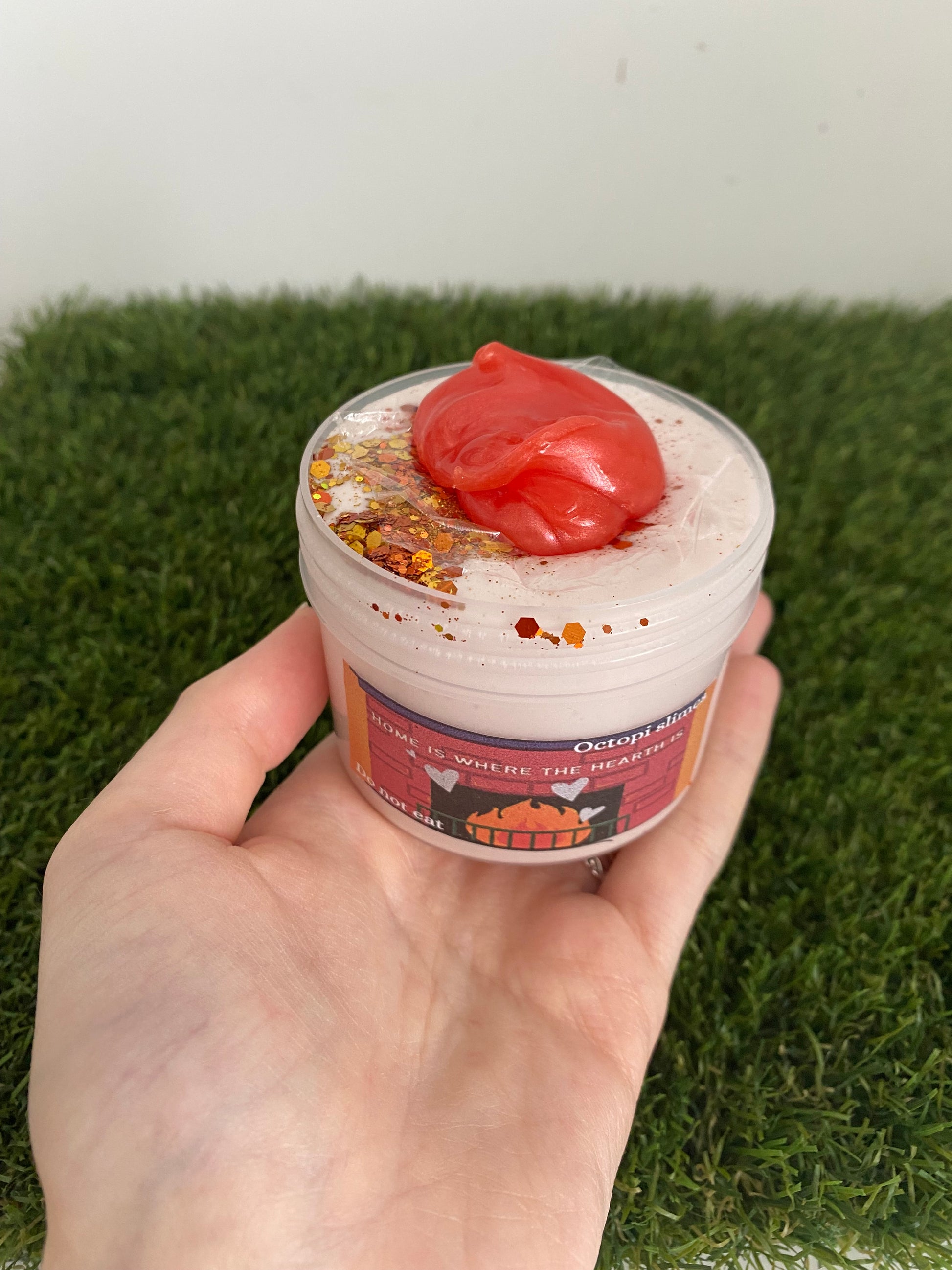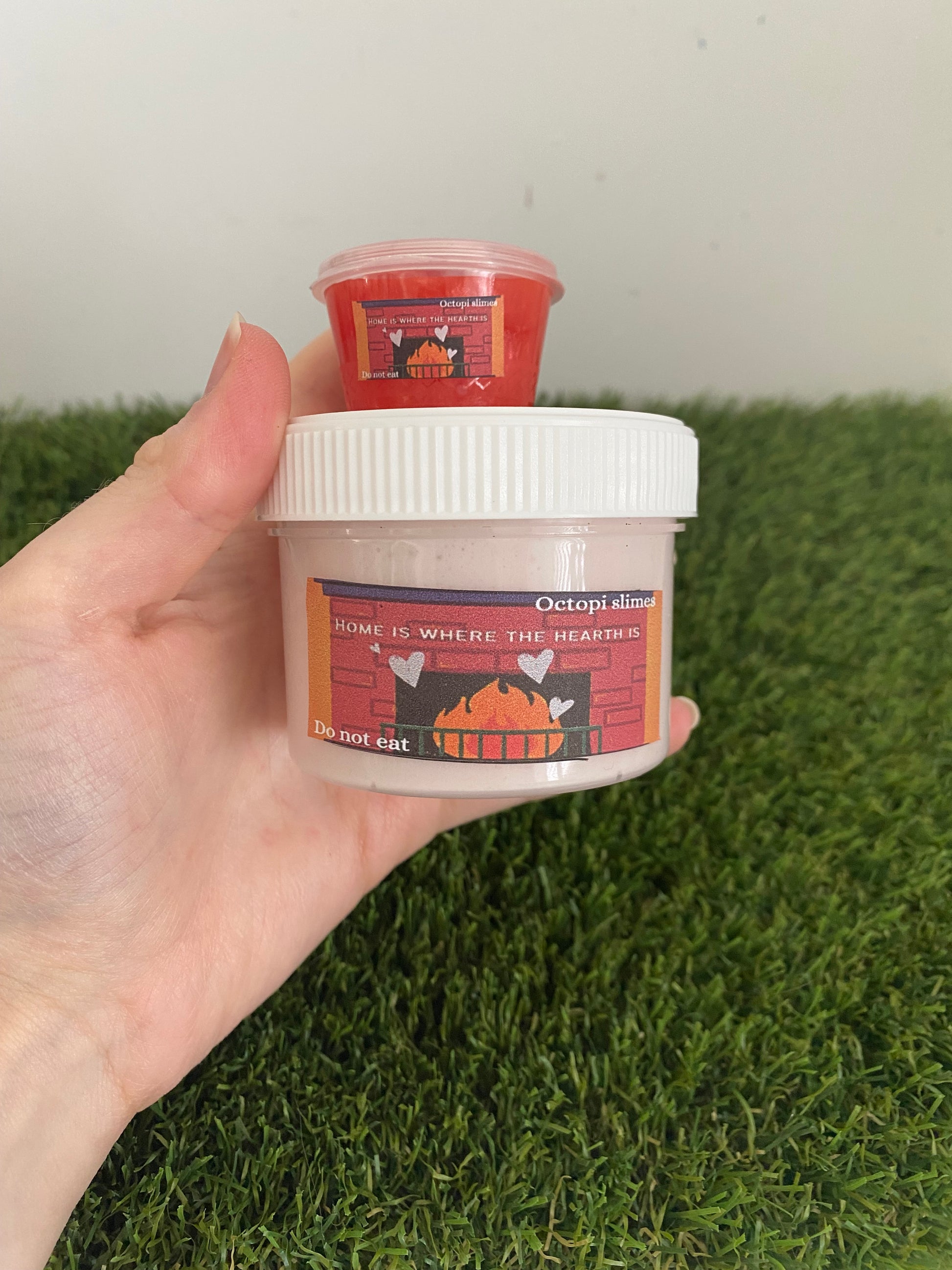 Home is where the hearth is is a light snowslay slime scented fresh linen/laundry detergent. It comes with a metallic 1oz topper and a fire fimo/glitter mix.