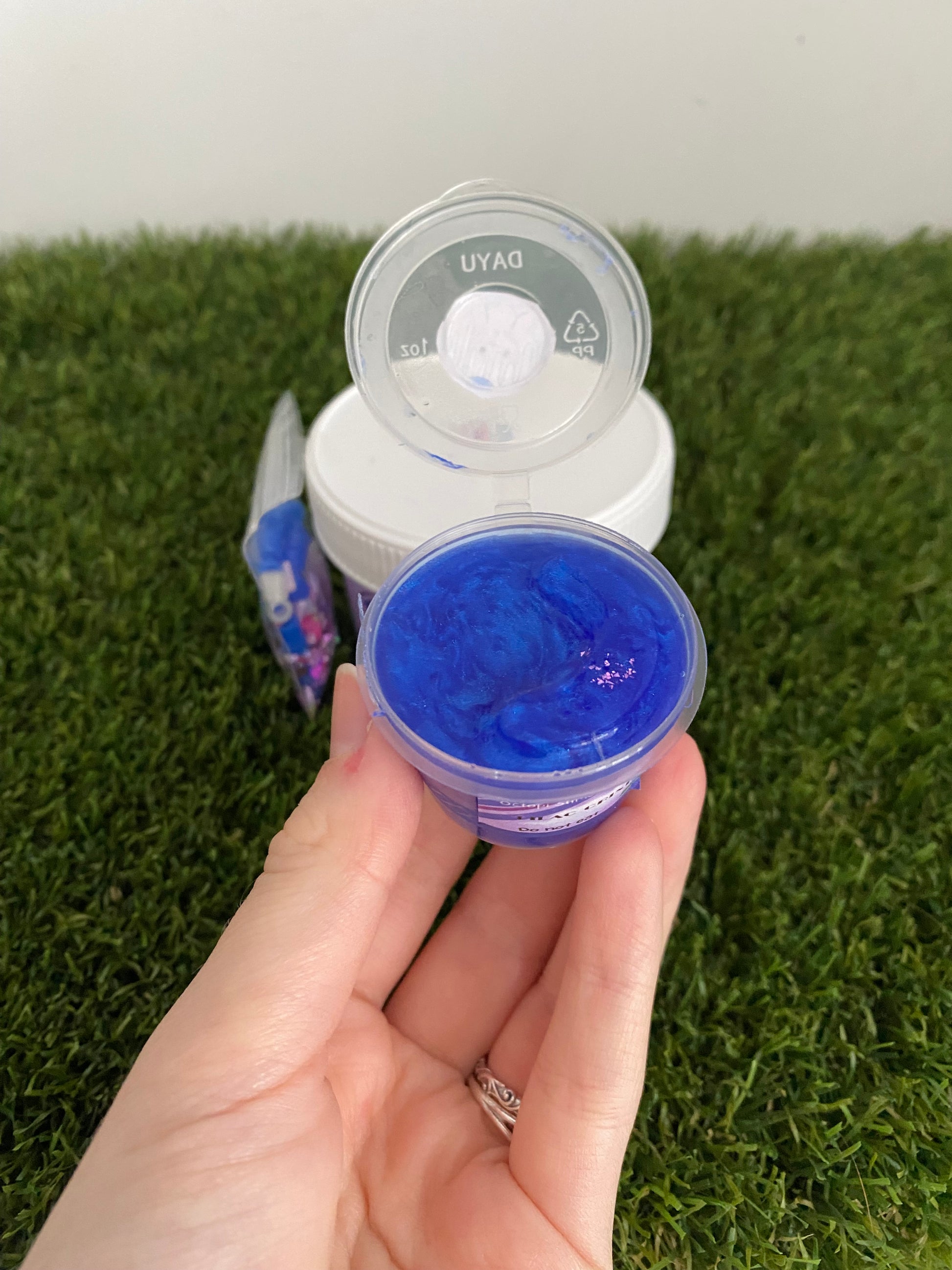 Lilac crisp is a white glue slushee slime scented apple and blackberry. It comes with a a metallic topper and a periwinkle glitter mix.